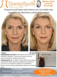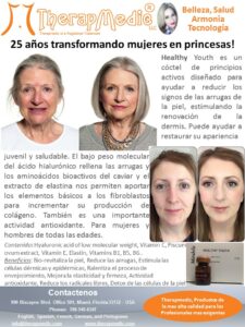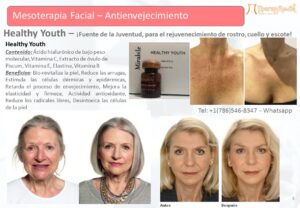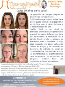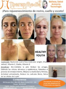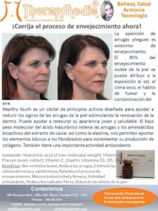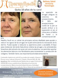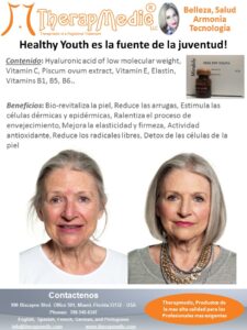 El ácido hialurónico actúa como transportador de vitaminas hacia las células. Healthy Youth estimulará a tu propio cuerpo a producir colágeno y elastina, eliminando así las arrugas en su conjunto en rostro, escote y cuello.