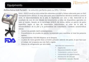 Extra-618 es el resultado de más de una década de tratamientos y miles de dispositivos operados en todo el mundo. Basado en la tecnología GEM-PL de Active, establece un patrón de pulso específico según el tipo de tratamiento seleccionado, el color de la piel, la fotosensibilidad de la piel y la profundidad del tratamiento. Contiene características únicas: