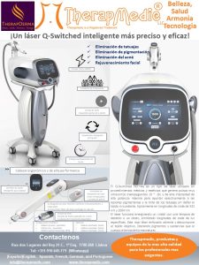 El Q-Swittched ND:YAG es un tipo de láser utilizado en procedimientos médicos y estéticos que genera pulsos muy ultracortos (nanosegundos 10 ^ -9)) y de alta intensidad de alta potencia máxima para apuntar selectivamente a las lesiones pigmentarias y la tinta de los tatuajes sin dañar el tejido circundante, típicamente en longitudes de onda de 532 nm y 2064 nm