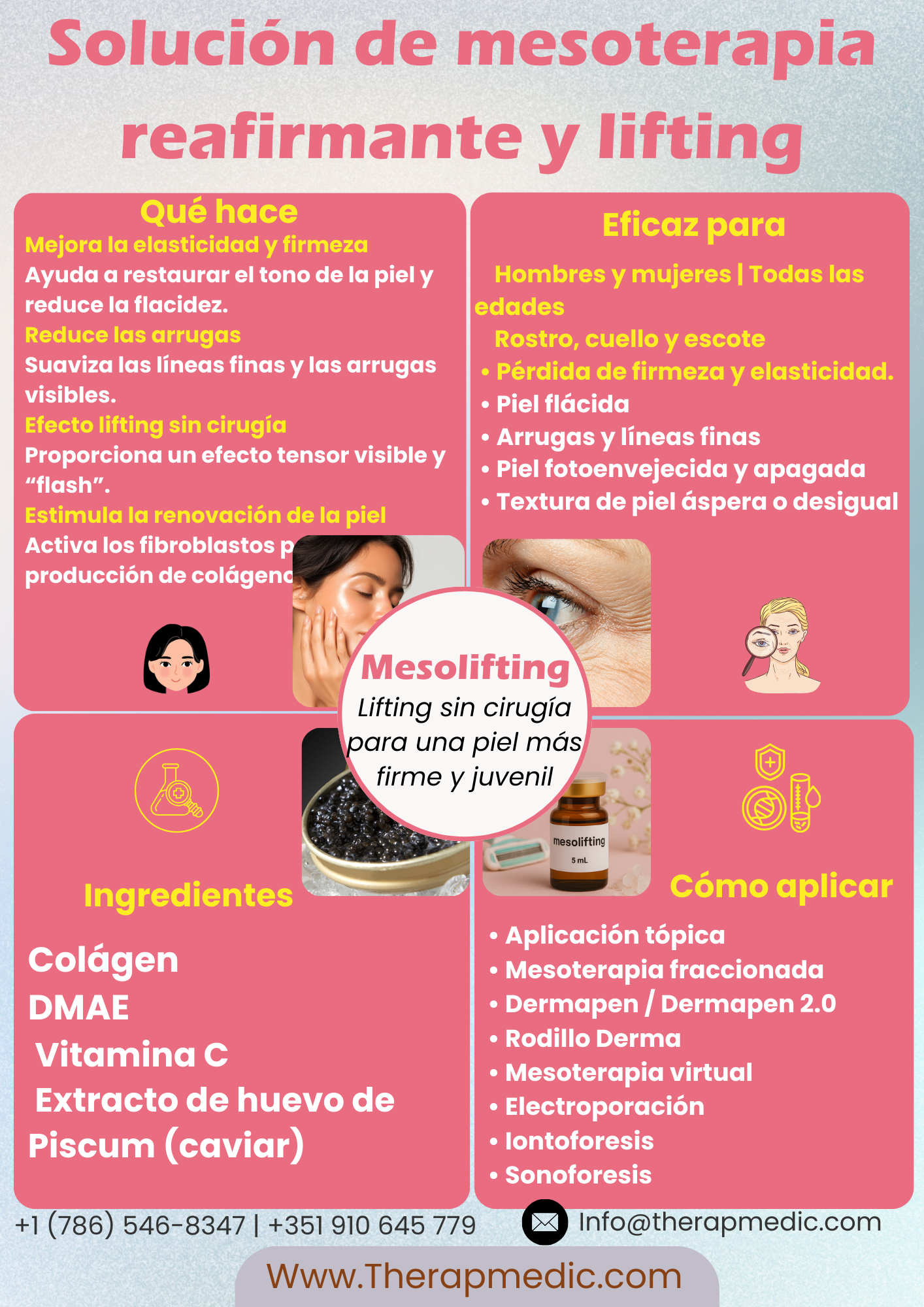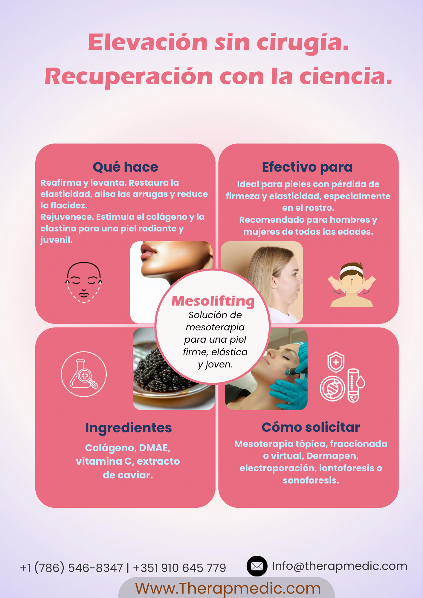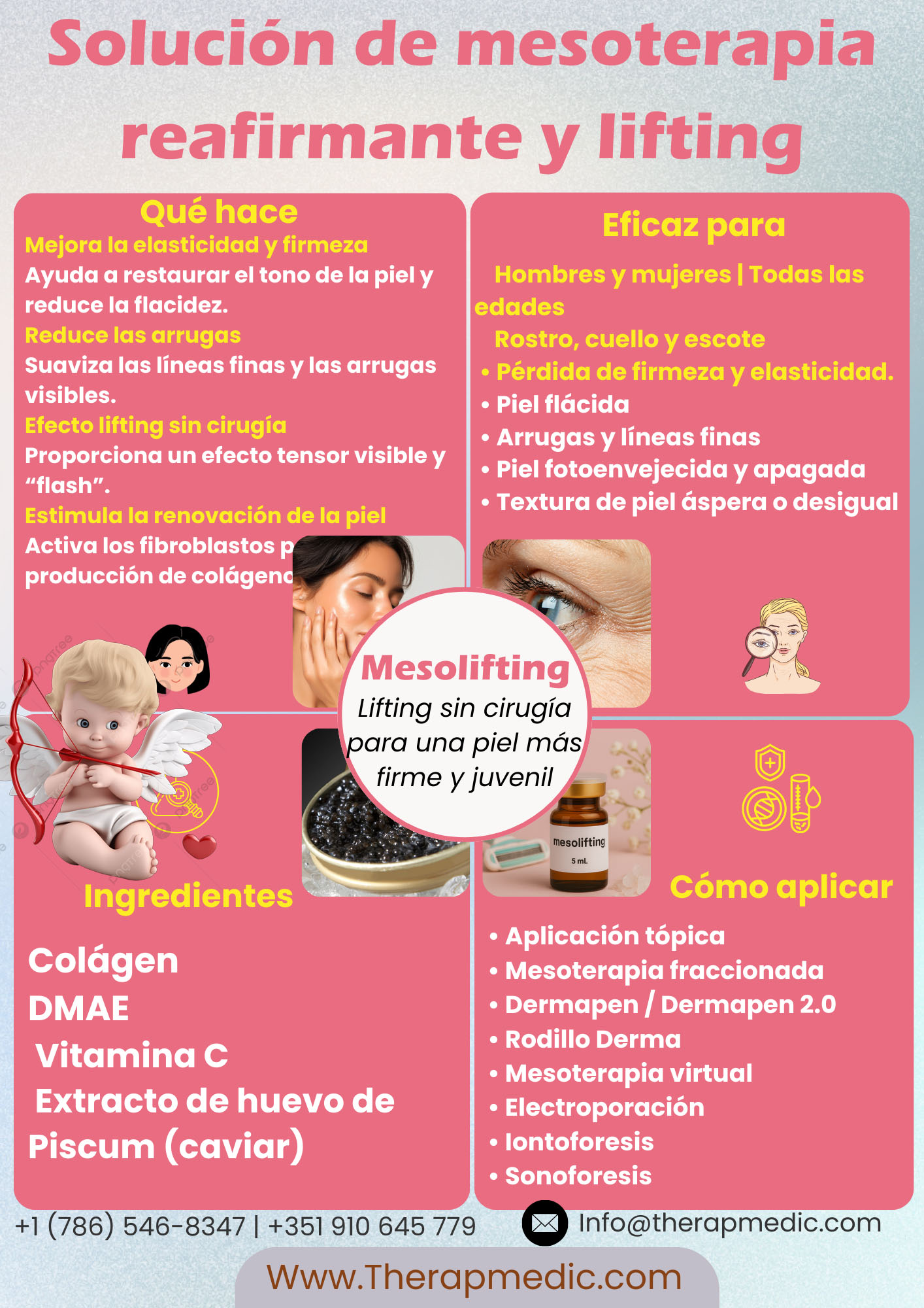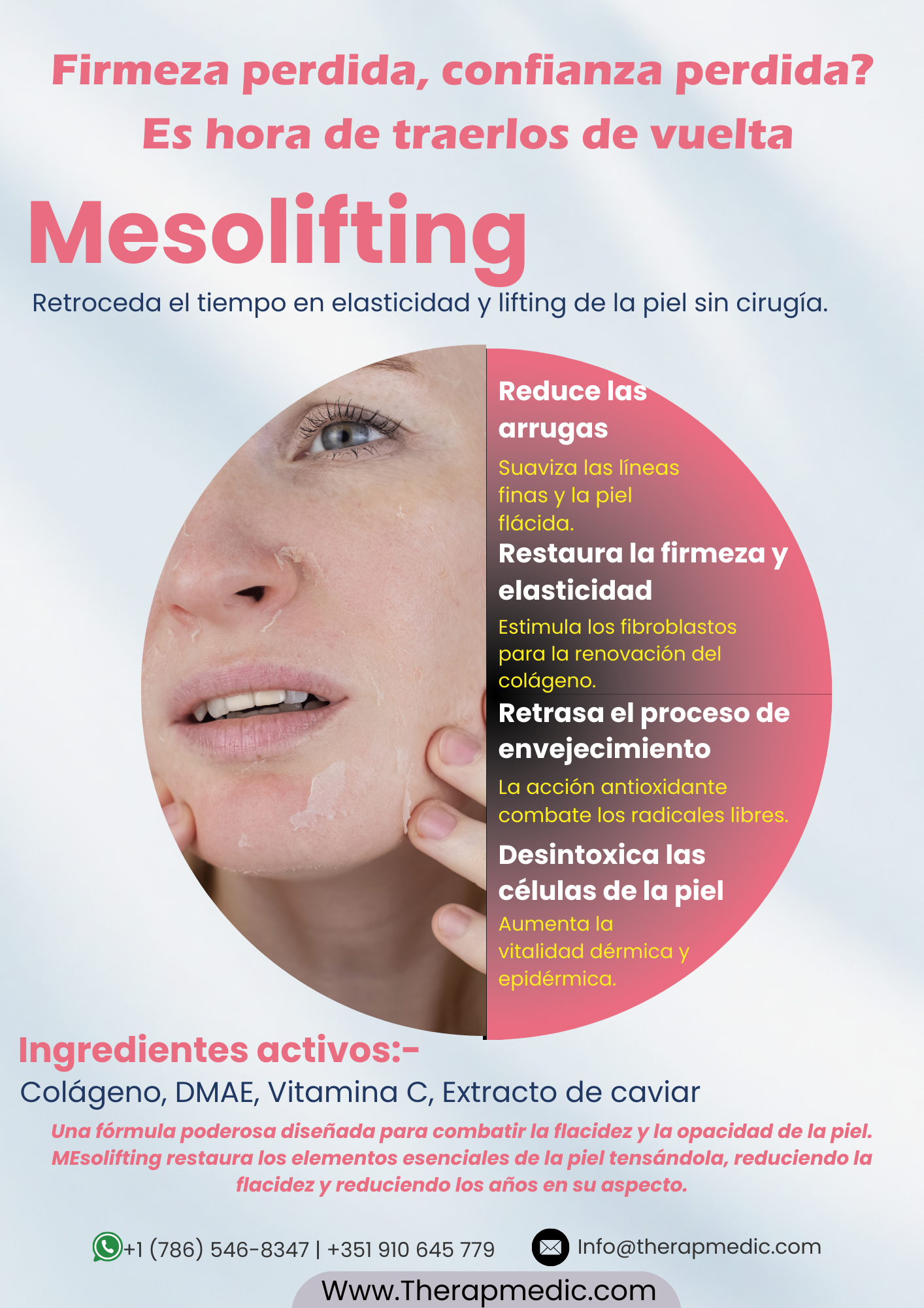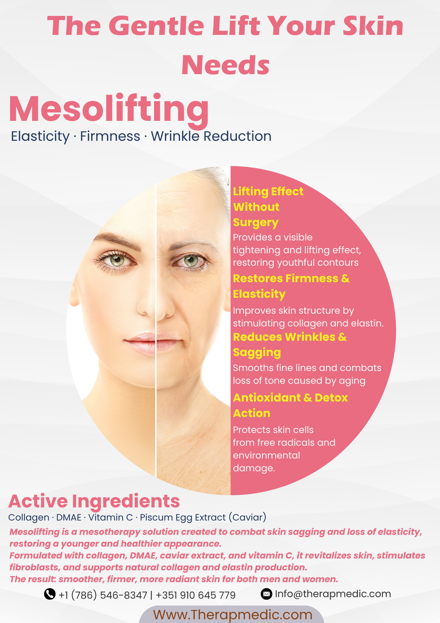 Mesolifting es una solución de mesoterapia para ayudar a aumentar la elasticidad y firmeza, reducir las arrugas. La piel aporta las primeras marcas evidentes del paso del tiempo. El envejecimiento de la piel es un proceso biológico complejo influenciado por una combinación de factores endógenos (genética, metabolismo celular, hormonas y procesos metabólicos) y exógenos (exposición crónica a la luz, contaminación, radiación ionizante, químicos, toxinas).