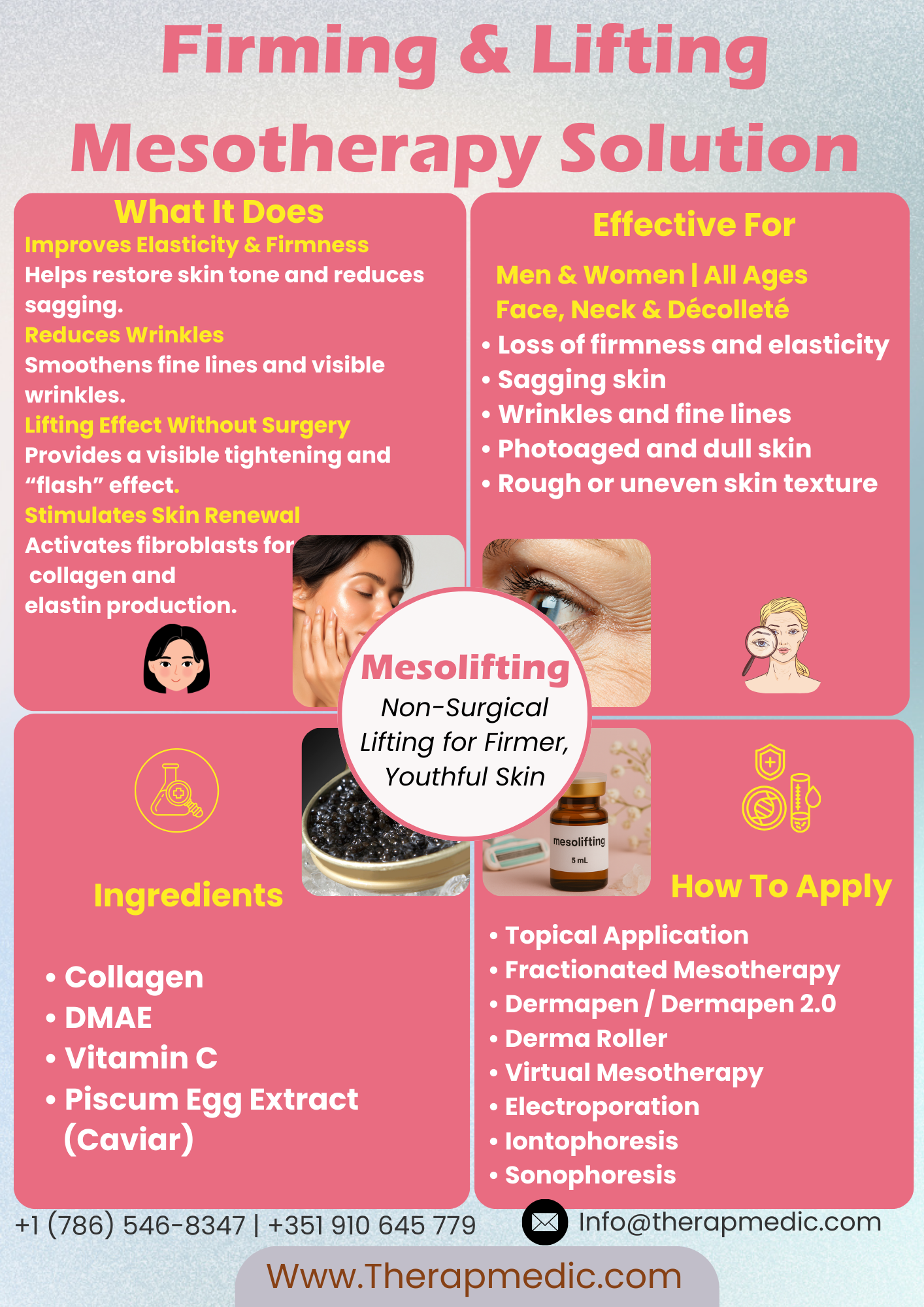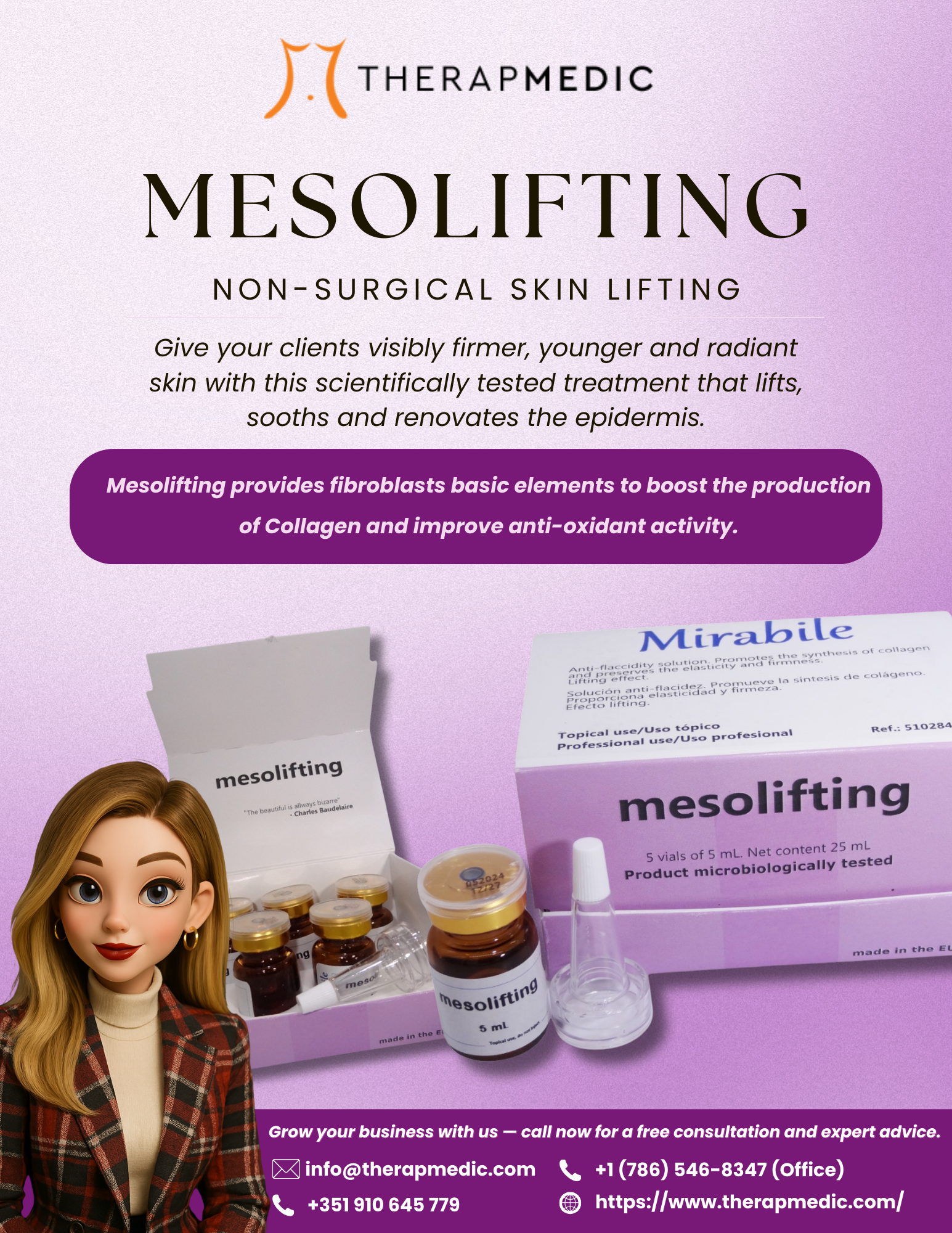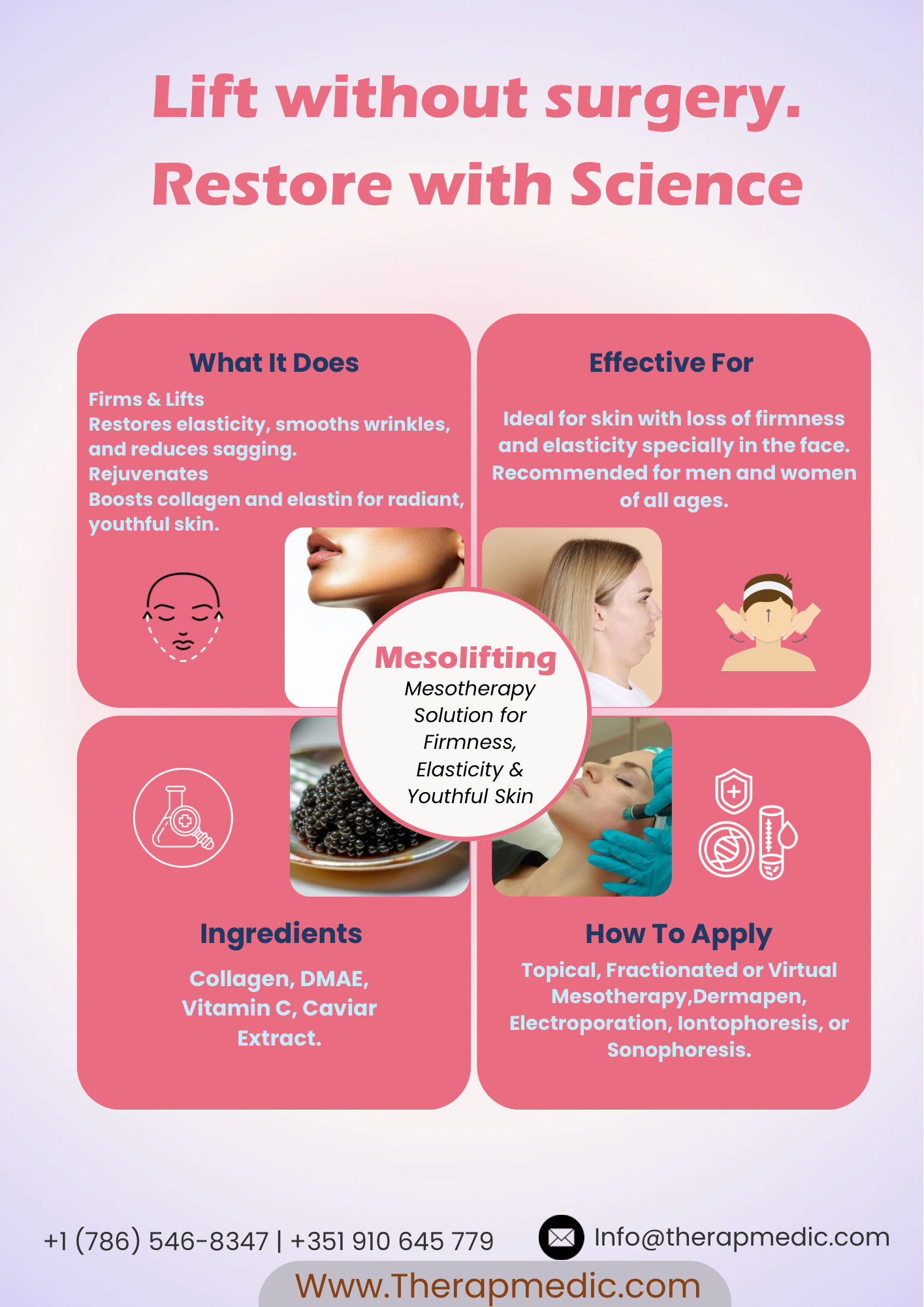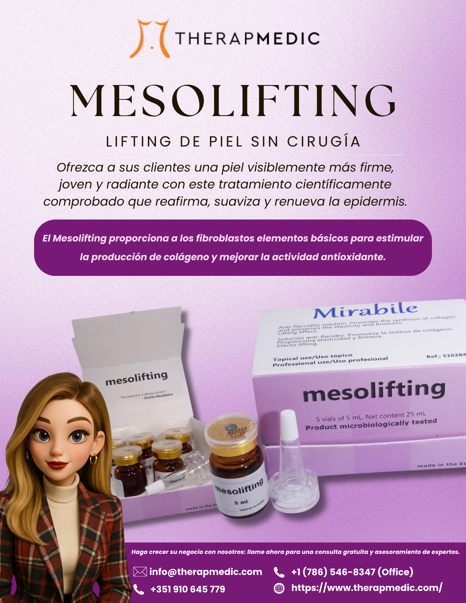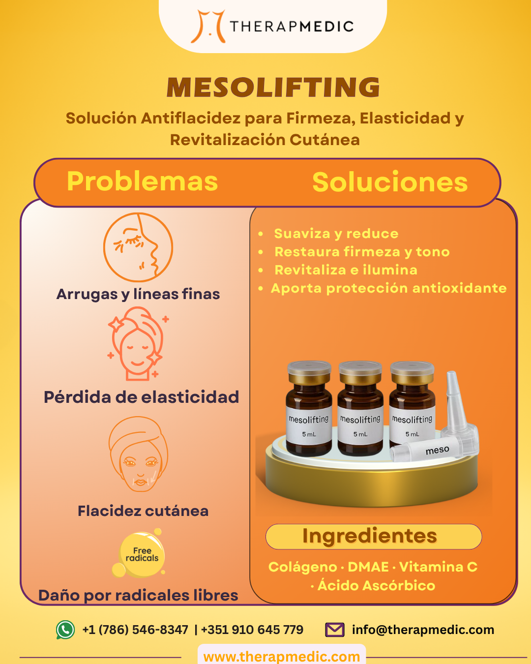 Mesolifting es una solución de mesoterapia para ayudar a aumentar la elasticidad y firmeza, reducir las arrugas. La piel aporta las primeras marcas evidentes del paso del tiempo. El envejecimiento de la piel es un proceso biológico complejo influenciado por una combinación de factores endógenos (genética, metabolismo celular, hormonas y procesos metabólicos) y exógenos (exposición crónica a la luz, contaminación, radiación ionizante, químicos, toxinas).