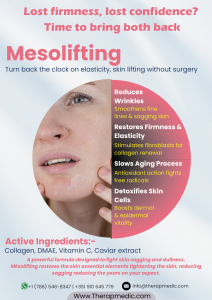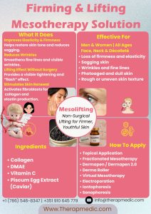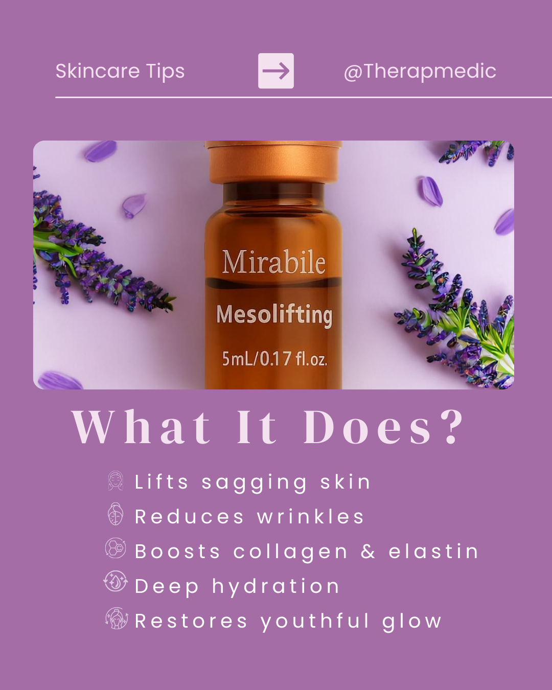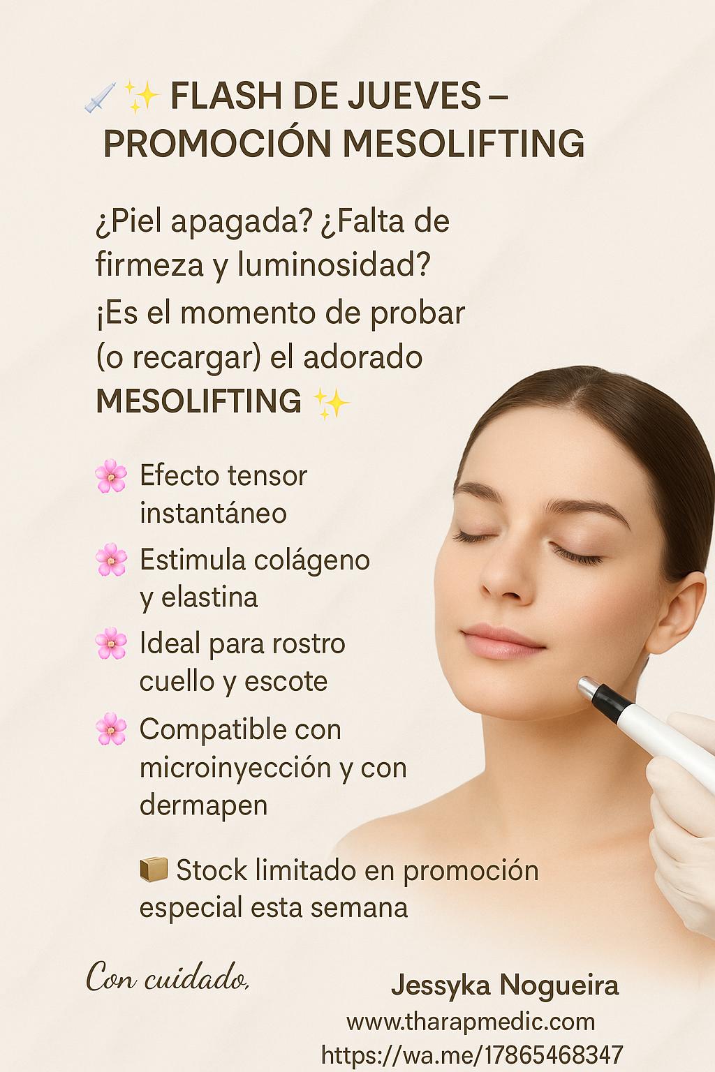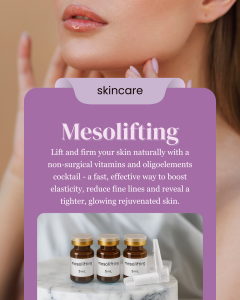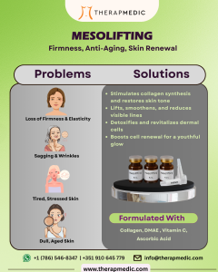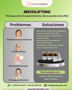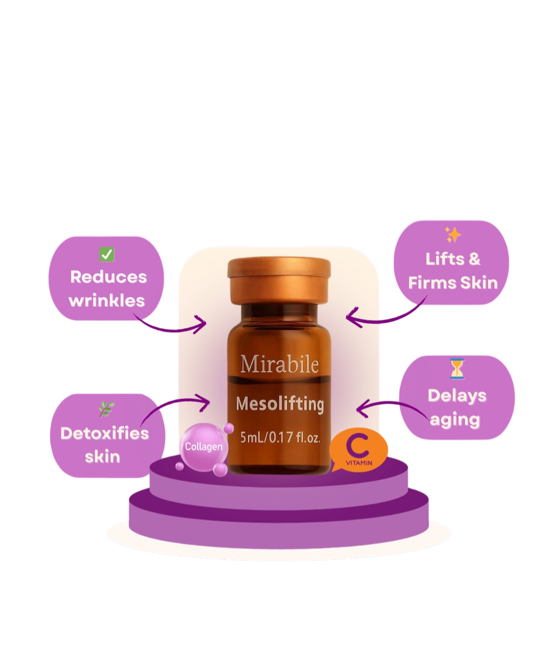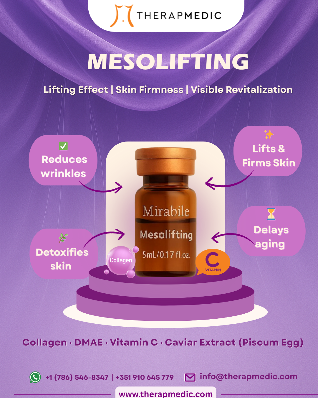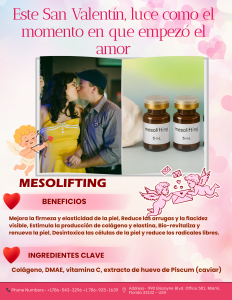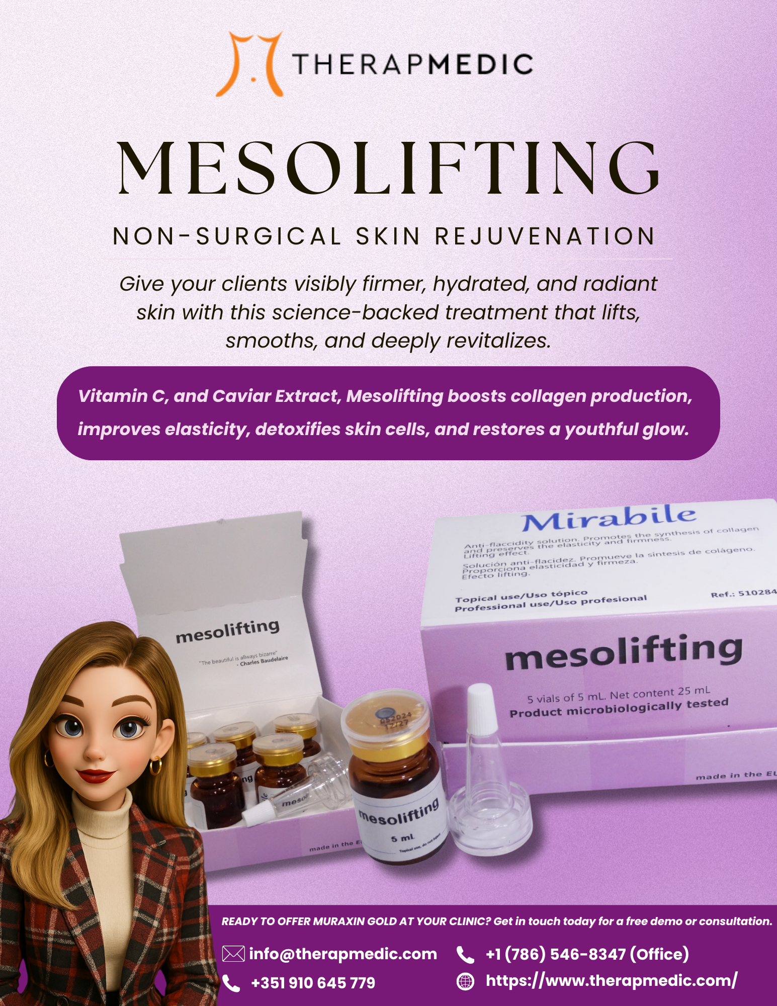 Mesolifting es una solución de mesoterapia para ayudar a aumentar la elasticidad y firmeza, reducir las arrugas. La piel aporta las primeras marcas evidentes del paso del tiempo. El envejecimiento de la piel es un proceso biológico complejo influenciado por una combinación de factores endógenos (genética, metabolismo celular, hormonas y procesos metabólicos) y exógenos (exposición crónica a la luz, contaminación, radiación ionizante, químicos, toxinas).