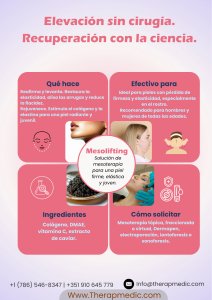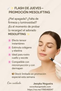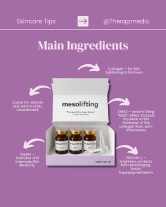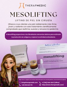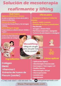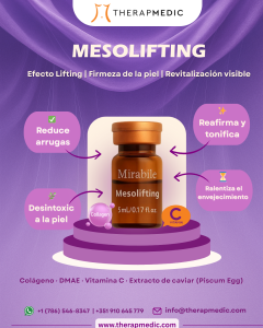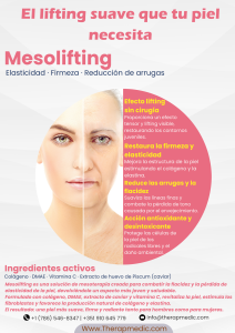 Mesolifting tiene un efecto lifting sin cirugía. Produce 3 efectos básicos: antioxidante; efecto flash debido a DMAE; induce la producción de elastina y colágeno porque también inducen la formación de fibroblastos.