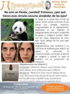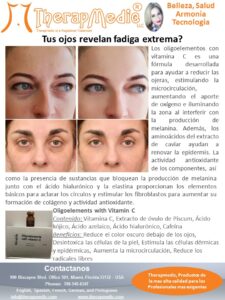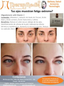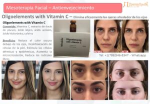 Esta solución de mesoterapia reduce las ojeras y la actividad antioxidante. La fatiga es la causa más común de las ojeras. Otras causas comunes de las ojeras son: alergias, herencia, irregularidades en la pigmentación, exposición al sol. Además, el adelgazamiento de la piel y la pérdida de grasa y colágeno pueden hacer que los vasos sanguíneos de color azul rojizo debajo de los ojos sean más notorios. Oligoelementos con Vitamina C es una fórmula diseñada para ayudar a reducir las ojeras estimulando la microcirculación, aumentando el aporte de oxígeno y blanqueando la zona al interferir en la producción de melanina. Además, los aminoácidos del extracto de caviar ayudan a renovar la epidermis. La actividad antioxidante de los componentes, así como la presencia de sustancias que bloquean la producción de melanina junto con el ácido hialurónico y la elastina, proporcionan los elementos básicos para aclarar las ojeras y estimular los fibroblastos para aumentar su formación de colágeno y actividad antioxidante.