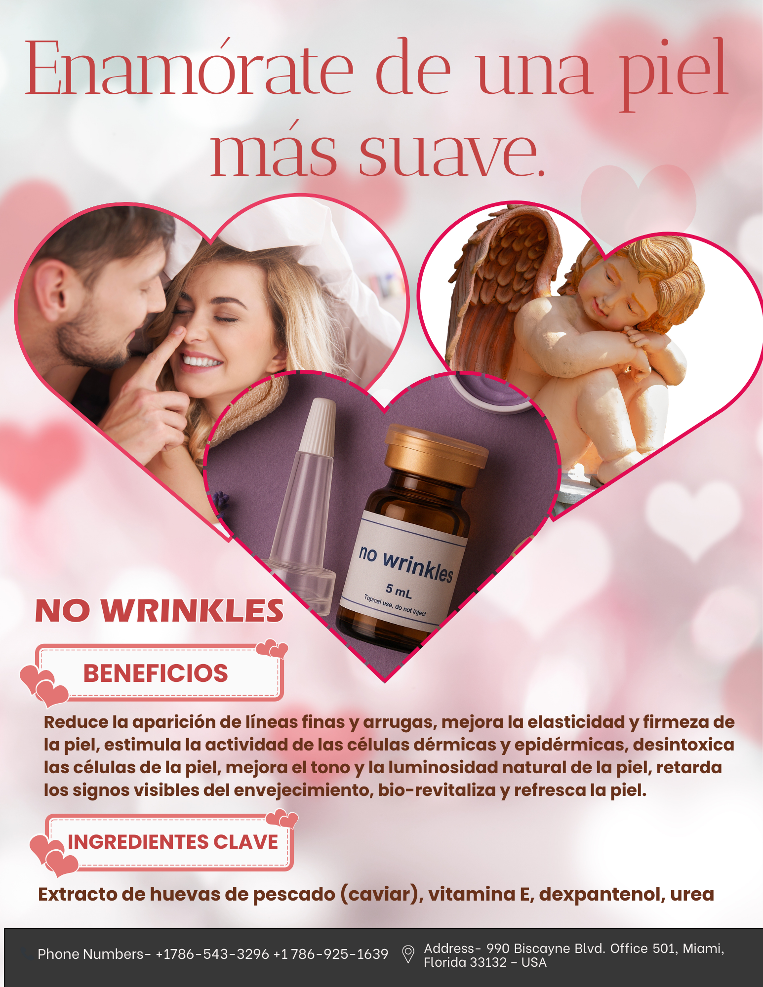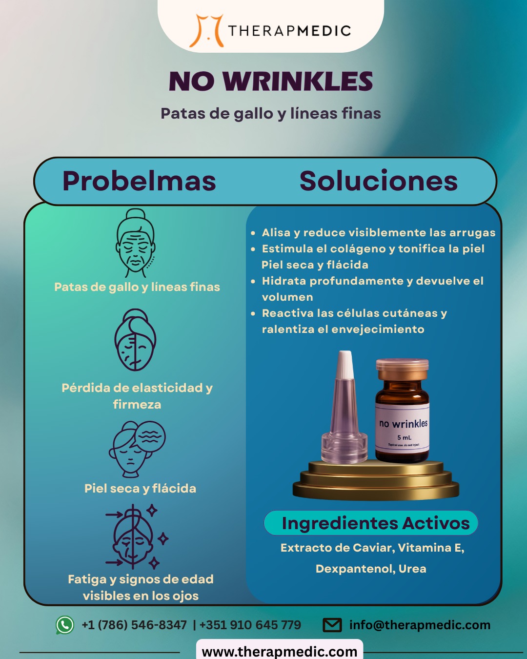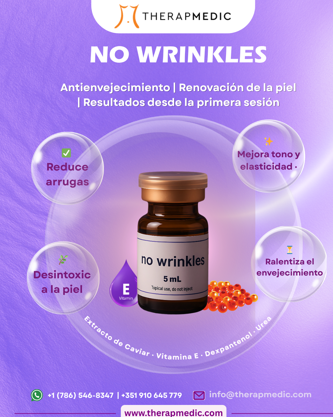 No Wrinkles é uma solução anti-envelhecimento concebida para corrigir em profundidade os primeiros sinais de envelhecimento da pele, restaurando o seu aspecto jovem e saudável. A contribuição especial de peptídeos, bem como de aminoácidos e oligoelementos da origem do caviar obtido em procedimento privado, aumenta os resultados visíveis da primeira sessão.