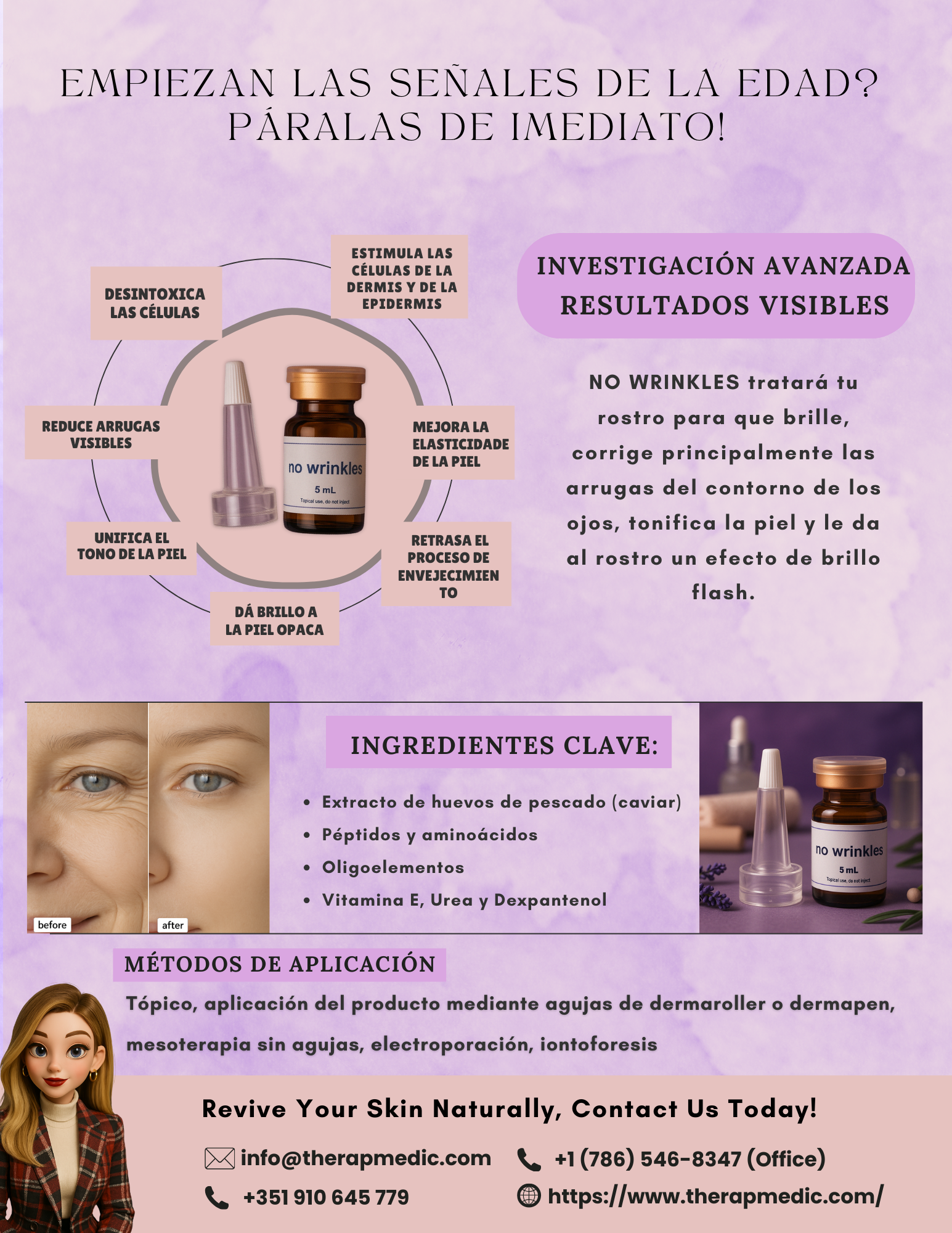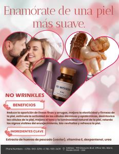A aparência do rosto normalmente muda com a idade. A perda do tónus muscular e o enfraquecimento da pele dão ao rosto uma aparência flácida ou caída. Em algumas pessoas, a papada flácida pode criar a aparência de um queixo duplo. A pele também resseca e perde a camada de gordura subjacente, de modo que o rosto não tem mais uma superfície lisa e carnuda. Até certo ponto, as rugas não podem ser evitadas. Além disso, a exposição ao sol e o tabagismo provavelmente fazem com que eles se desenvolvam mais rapidamente. No Wrinkles é uma solução anti-envelhecimento concebida para ajudar a corrigir em profundidade os primeiros sinais de envelhecimento da pele para restaurar a sua aparência jovem e saudável. A contribuição especial de peptídeos, bem como de aminoácidos e oligoelementos da origem do caviar obtido em procedimento privado, aumenta os resultados visíveis da primeira sessão.