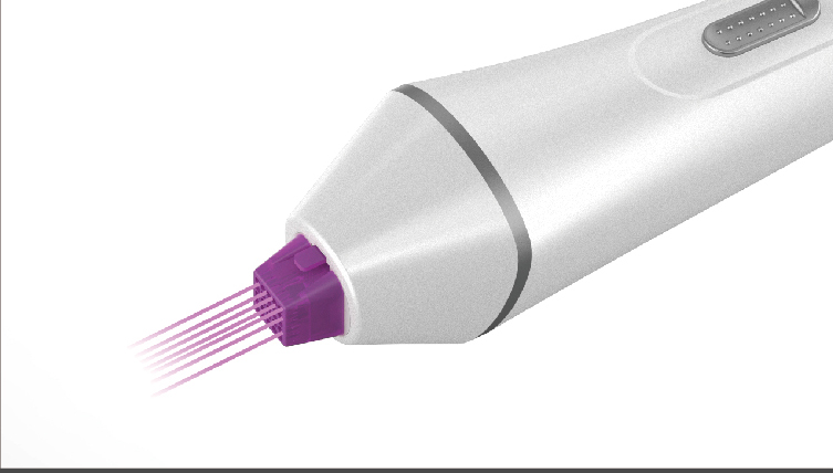 As agulhas da ponta roxa apenas entram em contato com a pele, o curto arco de plasma penetra profundamente na pele e um brilho local aparecerá. Forma de tratamento invasivo por alto nível de energia 6 a 10, para diferentes situações de pele pode-se escolher o nível exato de energia para rugas, olhos e cicatrizes. A epiderme irá quebrar completamente e a energia será liberada principalmente axialmente ao longo do caminho de ruptura. Atingindo a camada da papila dérmica e a camada reticular.